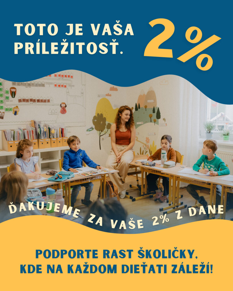 radi by sme sa uchádzali o Vašu priazeň a podporu formou poukázania 2% z Vašich daní. Aj takýmto jednoduchým spôsobom môžete prispieť k rozvoju našej školy, tentoraz najmä 2. stupňa. Poukázanie 2 % Vás navyše nič nestojí – ide o časť dane, ktorú by ste inak odviedli štátu. Staňte sa súčasťou príbehu Školičky, ktorá chce deťom vytvárať ešte kvalitnejšie, podnetnejšie a príjemnejšie prostredie na ich vzdelávanie. Jednoduchý postup nájdete nižšie.